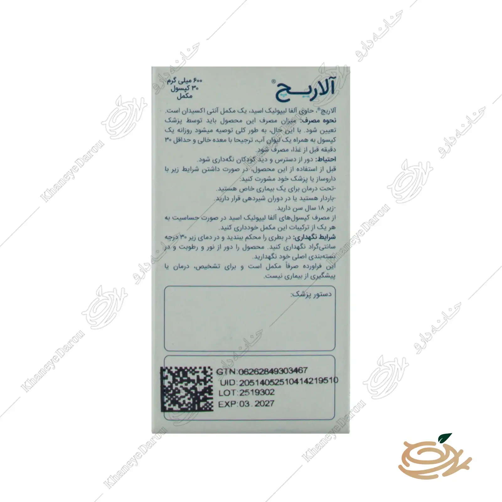 - دوز مؤثر: هر کپسول آلاریچ حاوی ۶۰۰ میلیگرم آلفا لیپوئیک اسید هست که دوز استاندارد و مؤثر برای درمان نوروپاتیه.