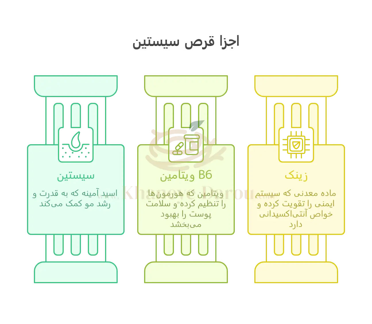 - سیستین: سیستین یک اسید آمینه است که در ترکیب کراتین، پروتئینی که به مو، پوست و ناخن ها قدرت و استحکام میدهد، نقش مهمی دارد. این ماده به کاهش ریزش مو و تقویت رشد آن کمک می کند.