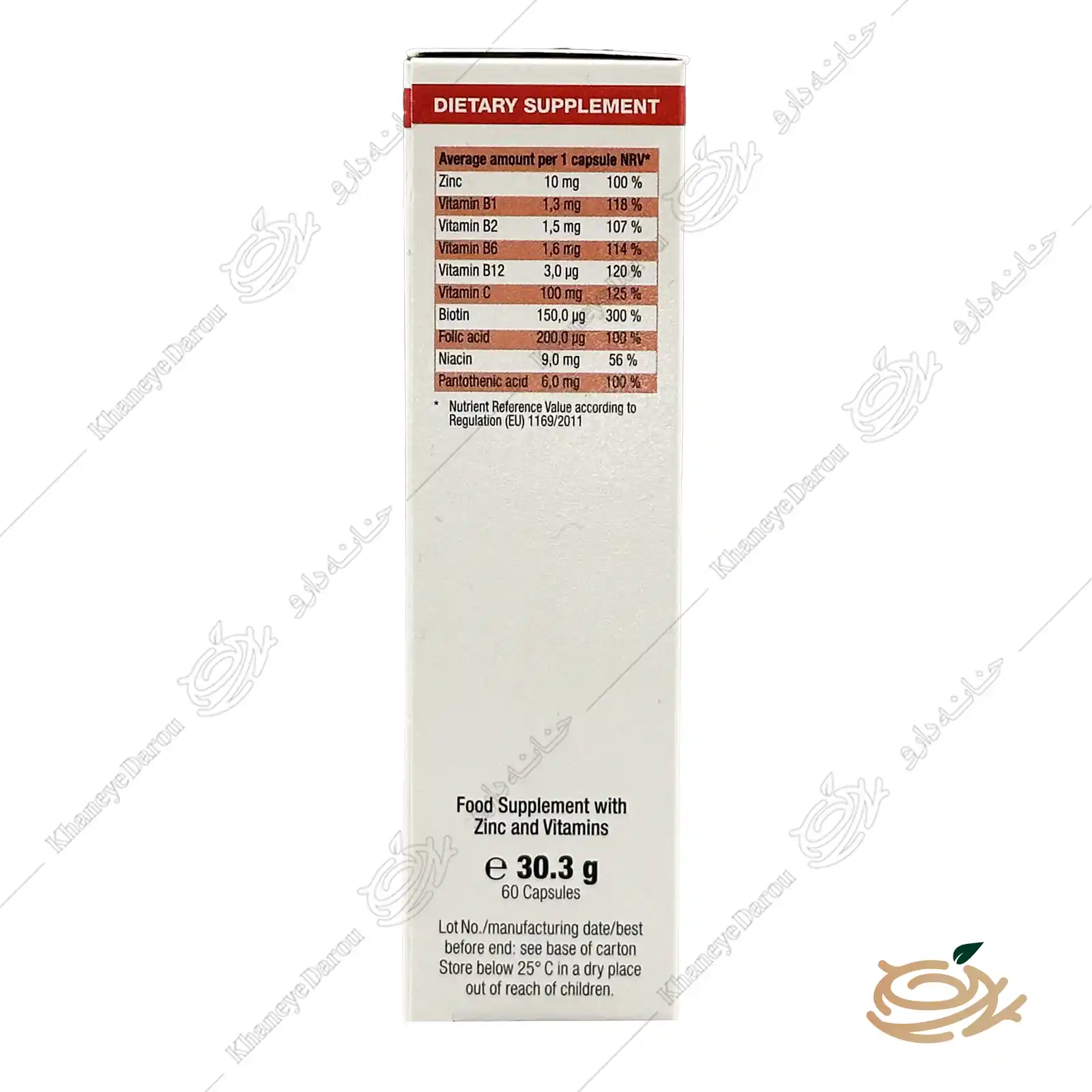 یا بیوتین در کنار زینک به بازسازی فولیکول های مو، بهبود رشد مو و ناخن، کمک می کند. زینک پلاس ب کمپلکس شرکت Eurho Vital، حاوی 150 میکروگرم بیوتین در هر کپسول است.