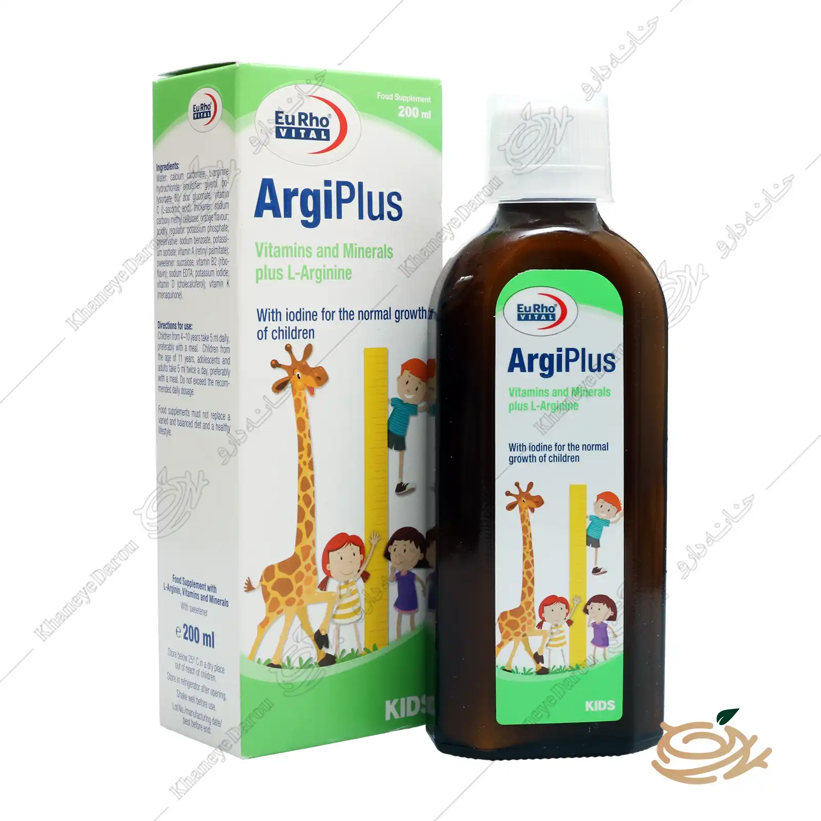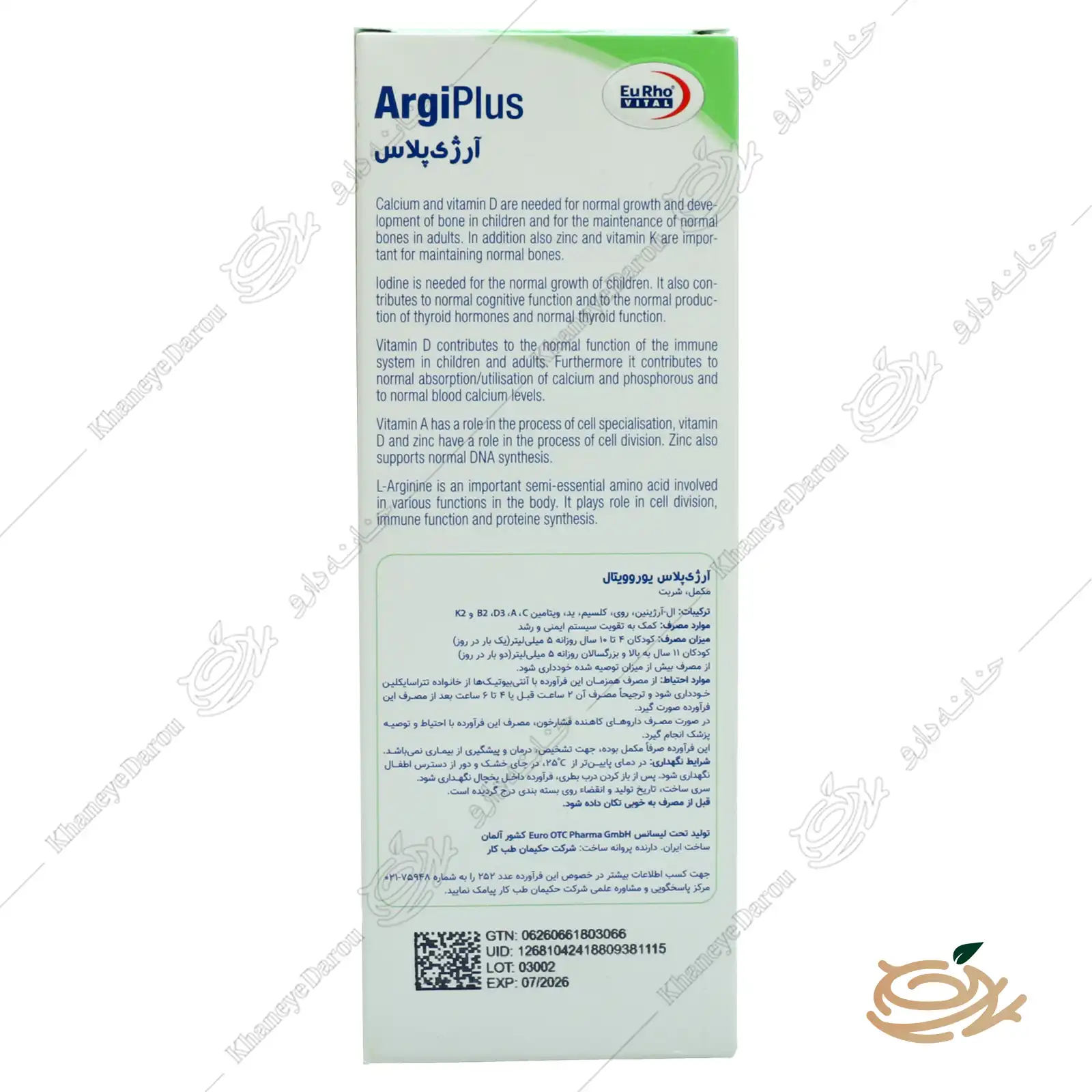 شربت آرژی پلاس یوروویتال (EuRho Vital ArgiPlus Syrup)، یک مکمل غذایی تخصصی تحت برند معتبر و EuRho Vital و تحت لیسانس آلمان است. این محصول، با بهره گیری از ترکیب علمی اسیدآمینه ال آرژنین، کلسیم، ویتامین D3، K2، B2، ویتامین A، روی، ید و فسفر، بهطور اختصاصی برای حمایت از رشد قدی، استخوانی و عضلانی در کودکان و نوجوانان طراحی شده است.