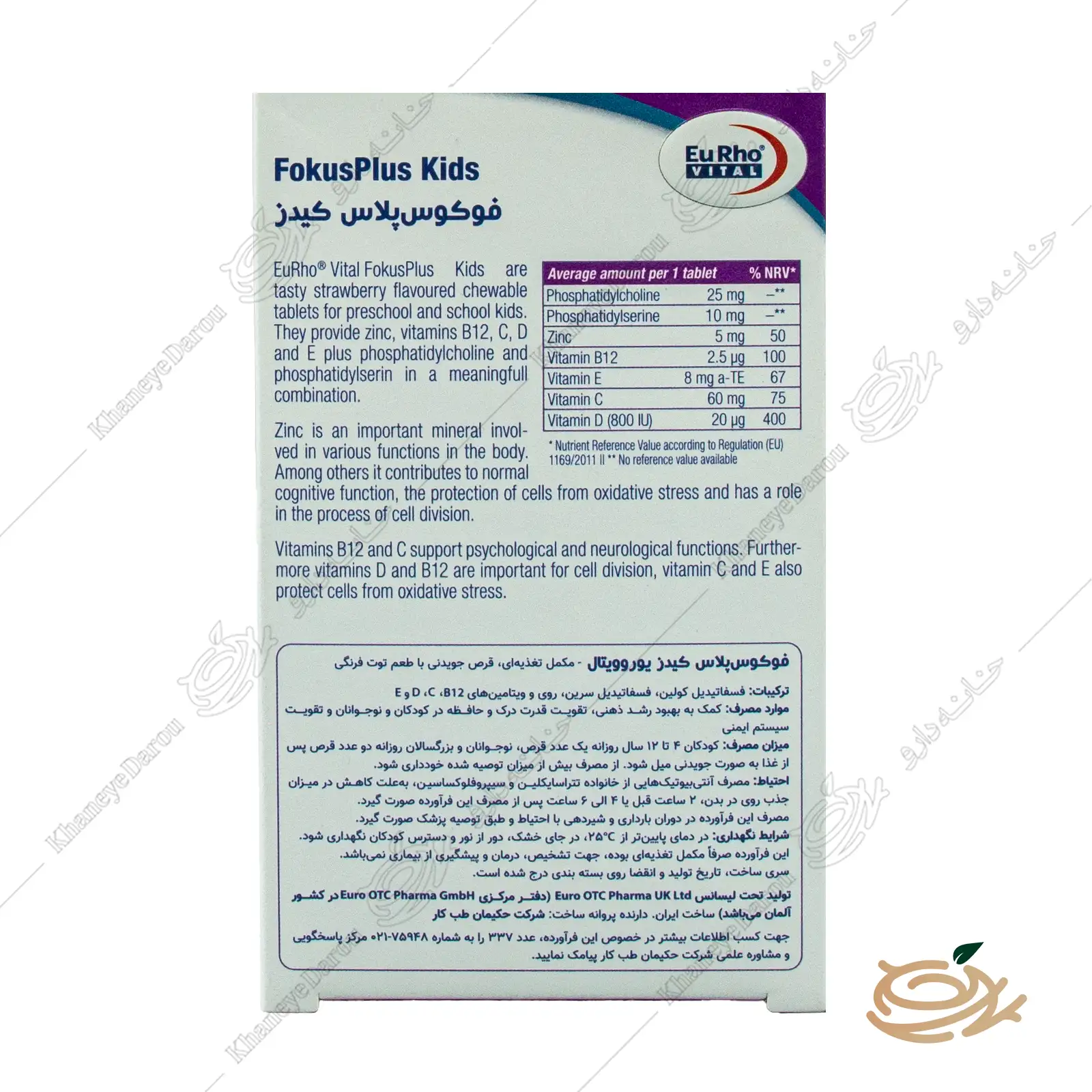 | کیفیت و پذیرش تضمینی | تحت لیسانس Eu Rho Vital آلمان با بالاترین استانداردهای کیفیت و در قالب قرصهای جویدنی با طعم دلپذیر توتفرنگی که کودکان مصرف آن را دوست دارند. |