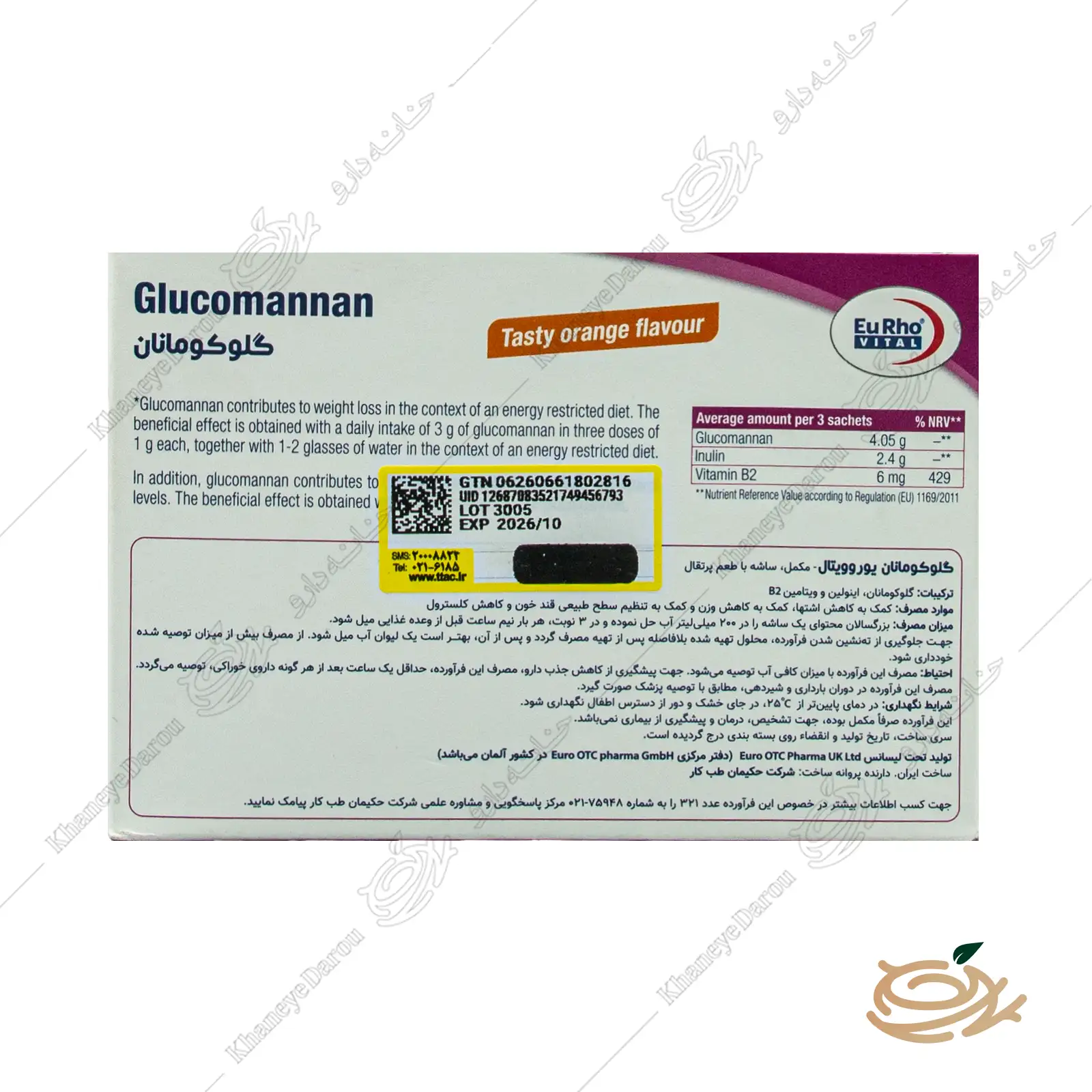 | آیا گلوکومانان یوروویتال چربی سوزی هم دارد؟ | به صورت غیرمستقیم بله. ویتامین B2 متابولیسم انرژی را بهبود میبخشد و کاهش دریافت کالری به واسطه سیری، خود باعث استفاده بدن از ذخایر چربی میشود. |