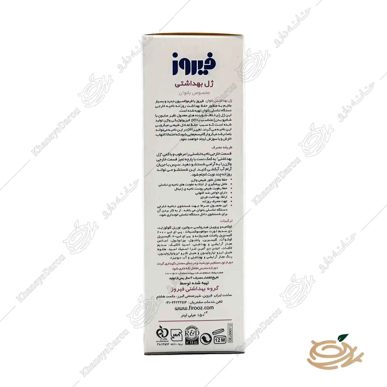 ترکیبات به کار گرفته شده در ژل بهداشتی بانوان فیروز، به حفظ بهداشت فردی، لطافت پوست و مرطوب کنندگی ناحیه تناسلی کمک بسیار زیادی کرده و از ایجاد حساسیت و عفونتهای رایج ناحیه ژنیتال جلوگیری می کنند.