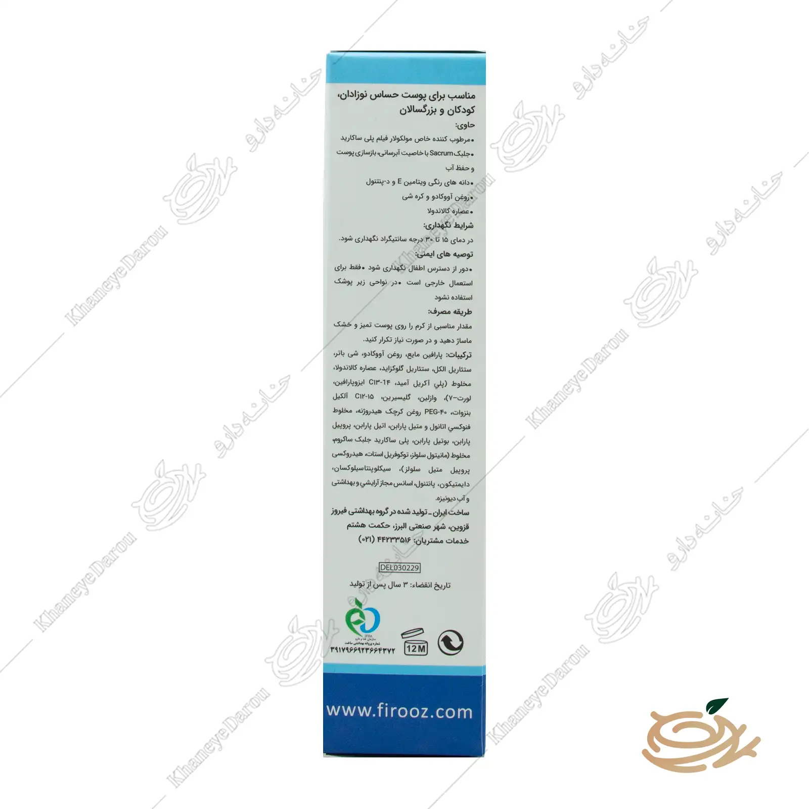 - “من نگران بودم کرمی که برای پوست دخترم استفاده میکنم باعث حساسیت بشه. اما این کرم فیروز واقعاً عالی بود. قرمزیهای اطراف دهانش بعد از دو روز استفاده کاملاً برطرف شد. مرسی خانهدارو بابت اصالت محصول!”