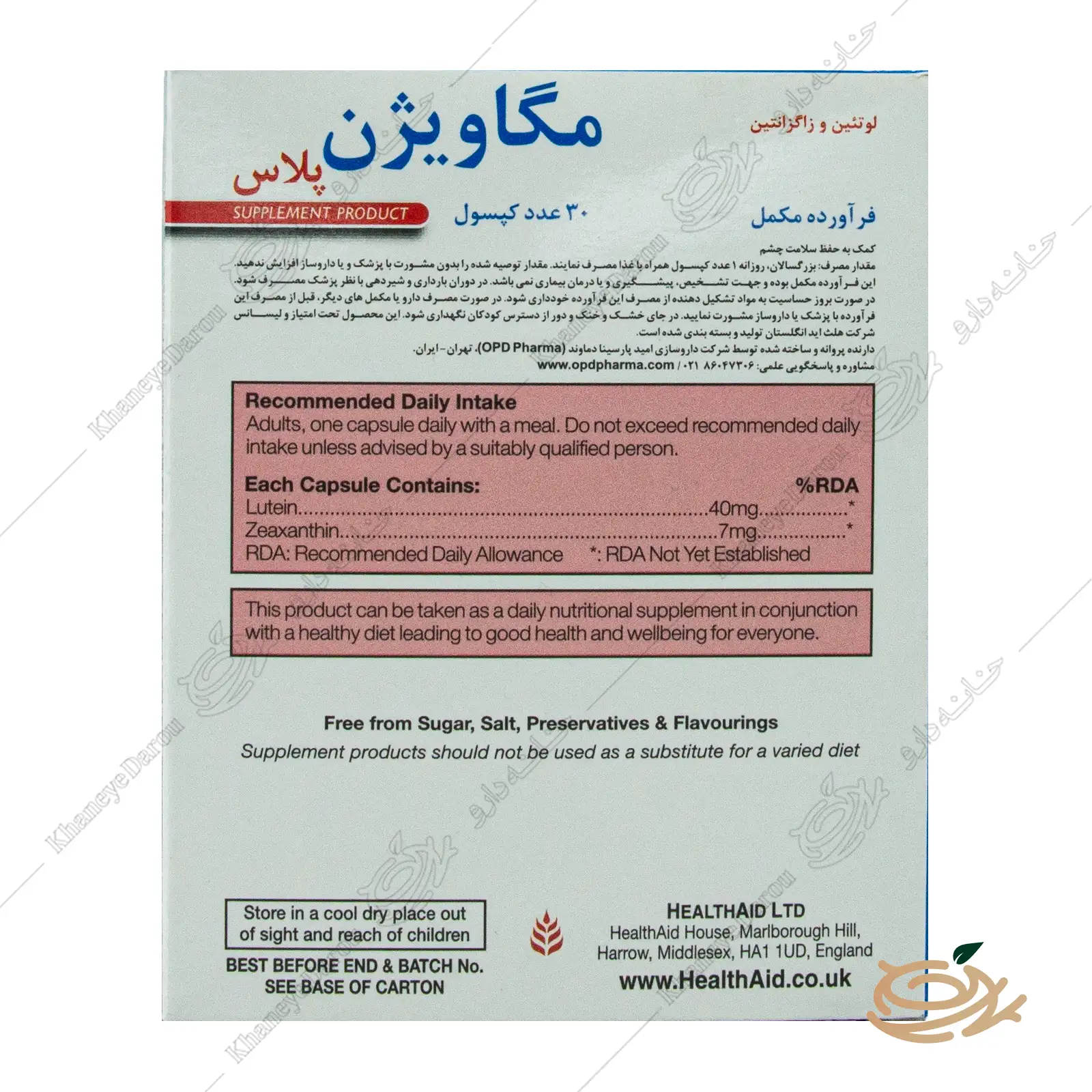 اینجاست که محصولی تخصصی مانند کپسول مگا ویژن پلاس از شرکت معتبر هلث اید (HealthAid LTD) وارد عمل میشود. این مکمل با فرمولاسیون ممتاز خود حاوی ۴۰ میلیگرم لوتئین و ۷ میلیگرم زآگزانتین، نه تنها یک تأمینکننده ساده ویتامین، بلکه یک سرمایهگذاری حیاتی بر روی کیفیت بینایی آینده شما محسوب میشود.