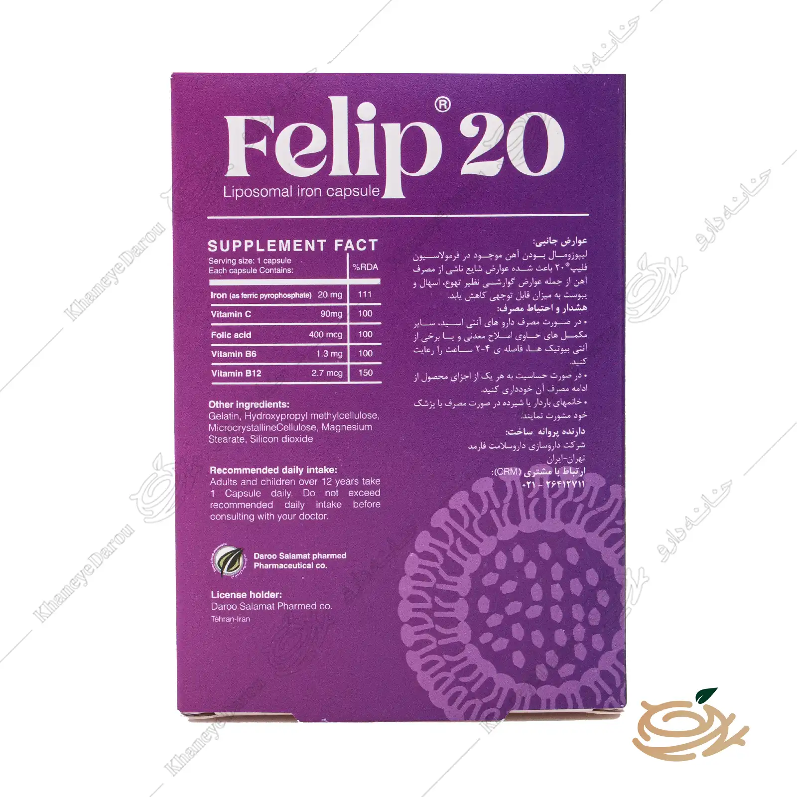قرص فلیپ 20 یک مکمل آهن لیپوزومال با فرمولاسیون پیشرفته است که برای پیشگیری و درمان کم‌خونی ناشی از فقر آهن، تامین نیاز روزانه بدن به آهن، ویتامین C، ویتامین‌ های گروه B (B6، B9  و B12) طراحی شده است. این محصول توسط شرکت داروسازی دارکو سلامت فارمد تولید و توسط پورسینا دارو به بازار عرضه می‌شود. هر بسته حاوی 30 عدد کپسول است و به طور اختصاصی برای افرادی که جذب آهن پایین یا عوارض گوارشی شدید از مصرف مکمل‌های آهن رایج دارند، توصیه می‌شود.