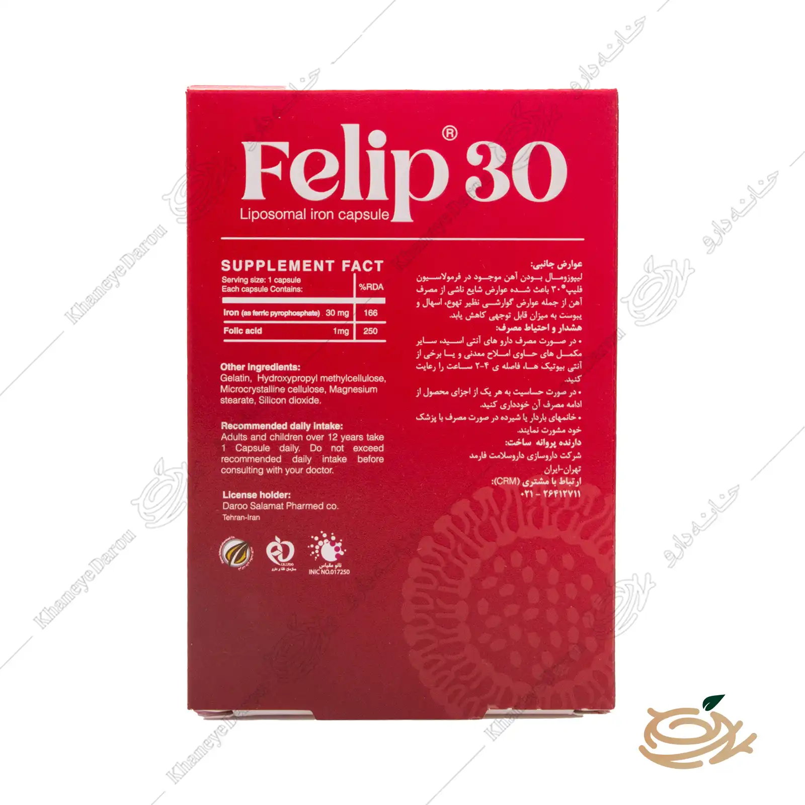 کپسول فلیپ 30 (Felip 30) یک مکمل آهن از نوع لیپوزومال است که برای پیشگیری و درمان کم‌ خونی ناشی از فقر آهن طراحی شده.