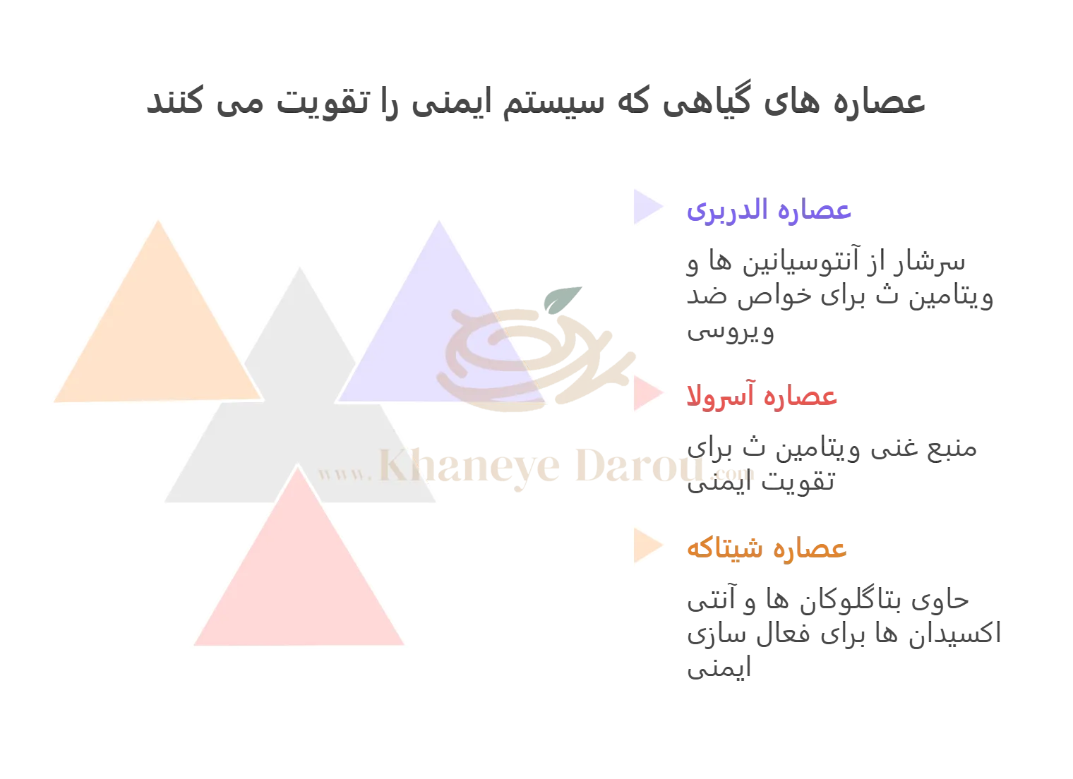 • عصاره الدربری: از میوه ‌های درختچه‌ی الدربری (Sambucus nigra) استخراج می‌شود. این عصاره حاوی ترکیباتی مثل: آنتوسیانین‌ ها، فلاونوئیدها و ویتامین ث می بشد که همگی در کنار هم تقویت کننده سیستم ایمنی بدن هستند. آنتوسیانین ‌های موجود در الدربری خواص ضد ویروسی و ضد التهابی دارند و به کاهش شدت و مدت سرماخوردگی و آنفلوآنزا کمک می‌کنند. همچنین این عصاره یک آنتی اکسیدان بسیار قوی است و که تولید رادیکال های آزاد را خنثی می کند.