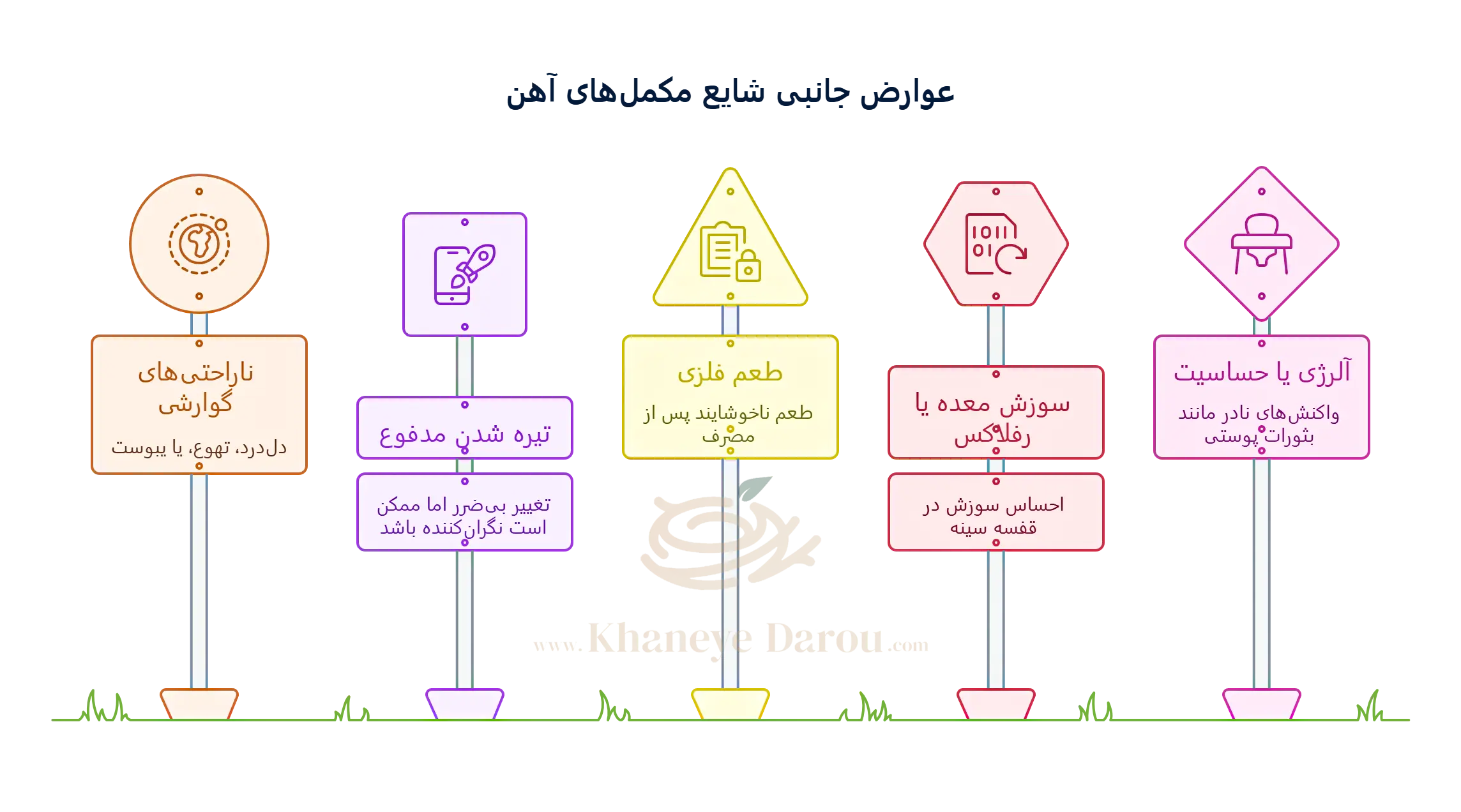 مصرف آهن در برخی افراد ممکن است باعث احساس سوزش معده یا رفلاکس شود.