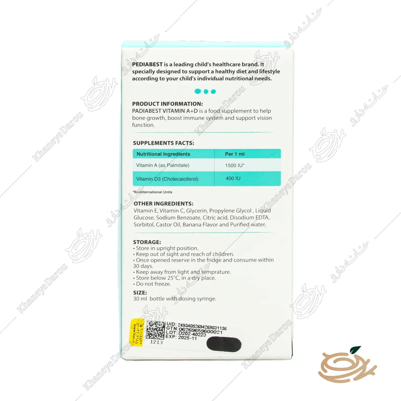 قطره ویتامین آ د پدیابست، یک مکمل مطمئن و کاربردی برای تامین نیاز روزانه ویتامین های A و D در نوزادان و کودکان است. این قطره با فرمولاسیون دقیق، کیفیت بالا و قیمت مناسب، انتخاب اول بسیاری از والدین ایرانی میباشد.