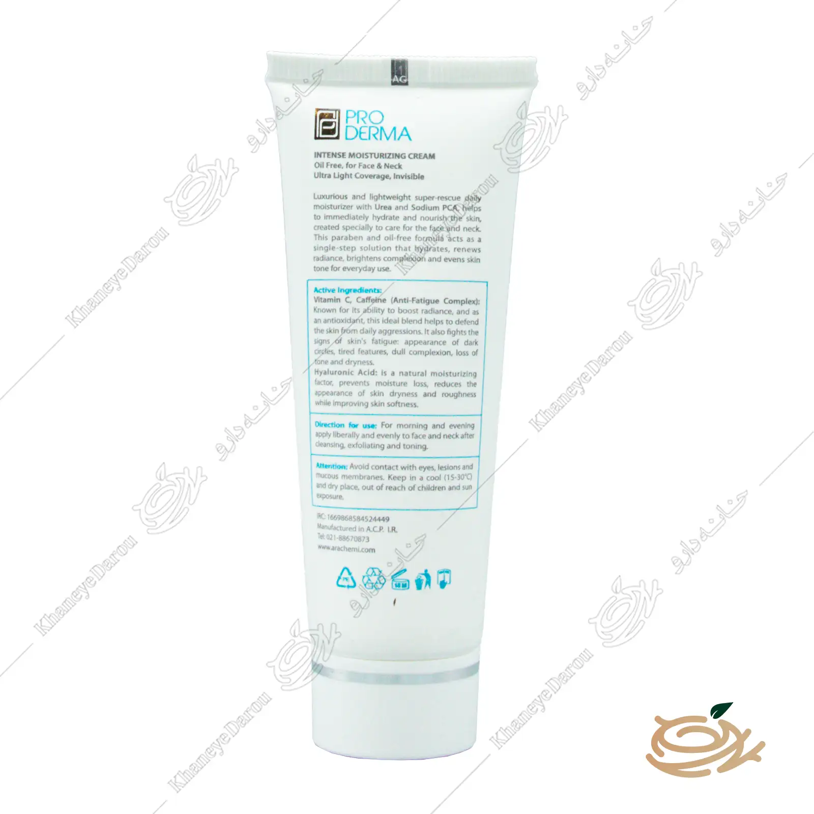 - خواص کرم مرطوب کننده پرودرما قوی فاقد چربی مناسب پوست صورت و گردن برای رفع کدری چیست؟ وجود کافئین و ویتامین C، پوست را از حالت بیحالی خارج کرده و درخشندگی آن را افزایش میدهد.