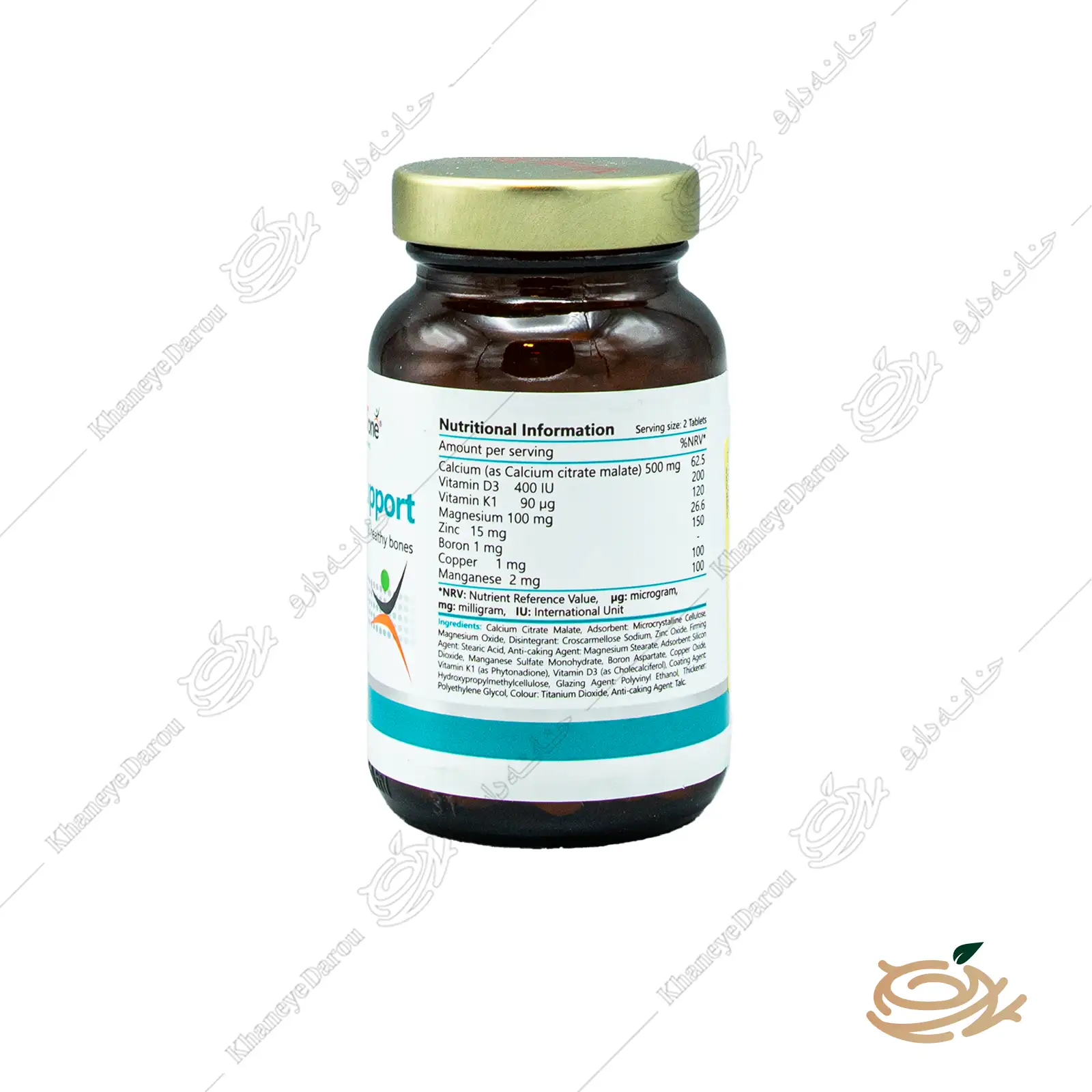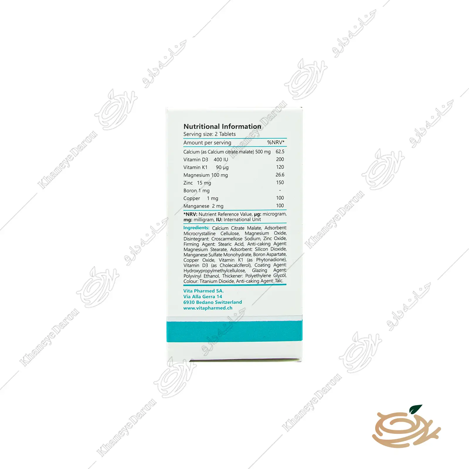 کلسیم در این مکمل به صورت کلسیم سیترات است که عوارض گوارشی مانند یبوست را به شدت کاهش می‌دهد. ویتامین D موجود در آن، باعث افزایش جذب کلسیم می‌شود و ویتامین K نیز از رسوب کلسیم در بافت‌های نرم مثل کلیه و عروق جلوگیری کرده و جذب کلسیم را افزایش می‌دهد. همچنین، وجود منیزیم، زینک، بور، مس و منگنز هر کدام به نوعی به پایداری و اثربخشی این فرآیند کمک می‌کنند.”