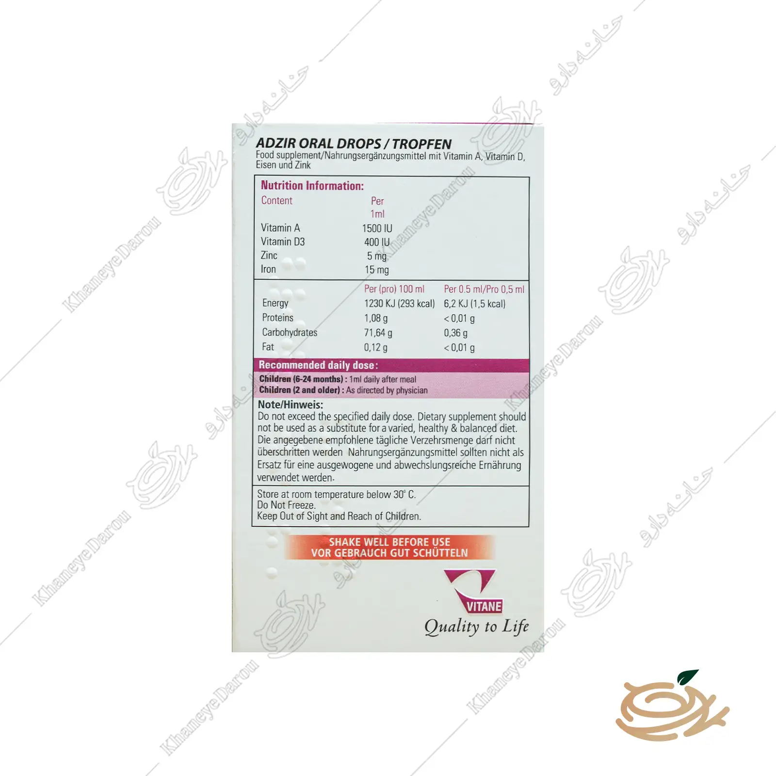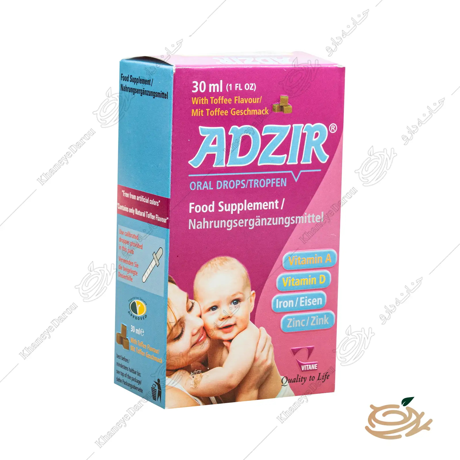 - قطره آدزیر ویتان یک مکمل تخصصی برای تامین آهن، زینک، ویتامین A و D3 کودکان است که به رشد قد و وزن، تقویت سیستم ایمنی و بهبود اشتهای کودک کمک میکند.